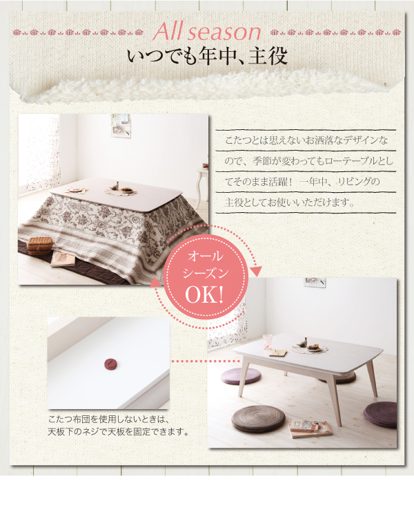 こたつとは思えないお洒落なデザインなので、季節が変わってもローテーブルとしてそのまま活躍! 一年中、リビングの主役としてお使いいただけます。