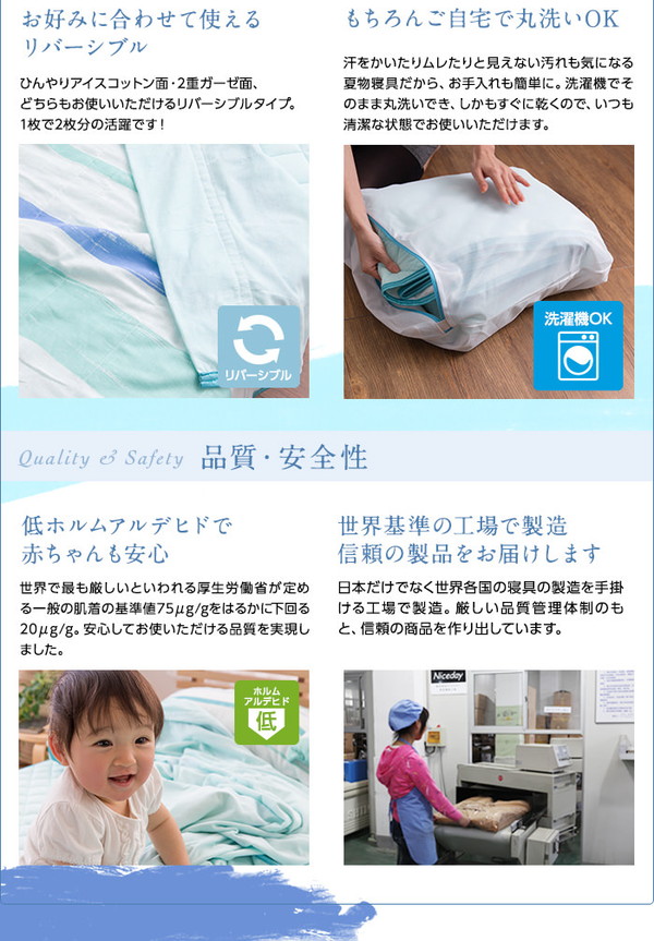 化学薬品の使用ゼロ!綿100%なのにひんやりする新快適素材アイスコットンを使用したガーゼケット。ガーゼ2層+アイスコットンの3層仕様で汗べたも解消。
