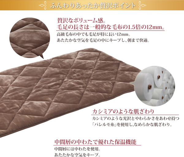 ボリューム感となめらかな肌ざわりをあわせ持つ贅沢な素材をふんだんに使用。あたたかな空気をたっぷりとキープし、朝までここちよい眠りをお届けします。高級毛布の中でも毛足が特に長い12mm。カシミヤのような光沢とやわらかさを持つ「パレルモ糸」を使用。丁寧に編み上げたニット生地の両面に特殊加工を施すことで軽くて保温性が高く、やわらかな肌ざわりに仕上がりました。