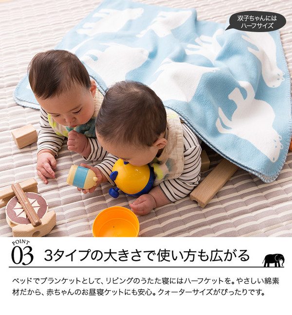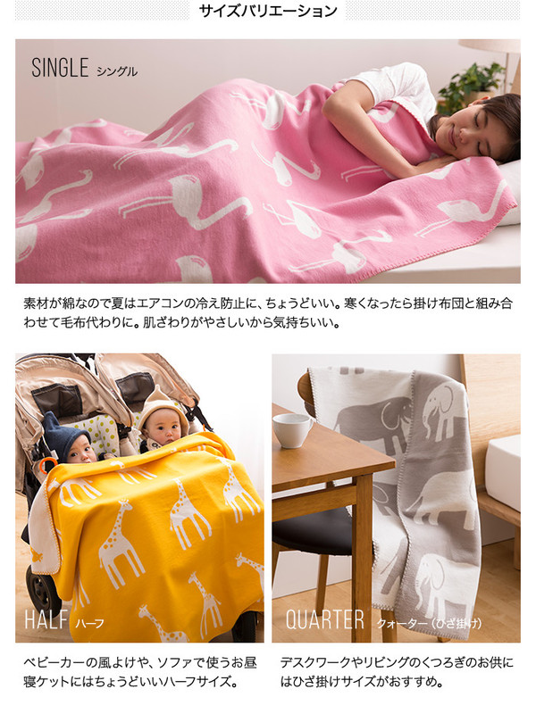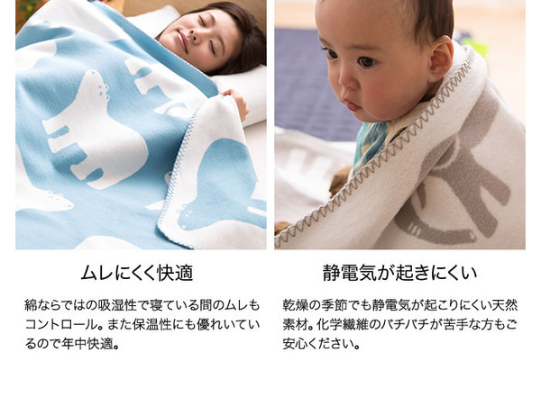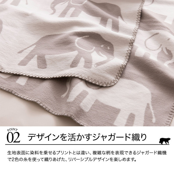 かわいい動物柄を織り込み起毛をしたブランケット。綿毛布ならではのやさしい風合いでリビング用、ベビーのためのギフトにも。