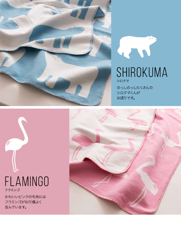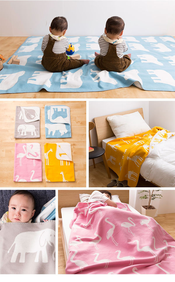 かわいい動物柄を織り込み起毛をしたブランケット。綿毛布ならではのやさしい風合いでリビング用、ベビーのためのギフトにも。