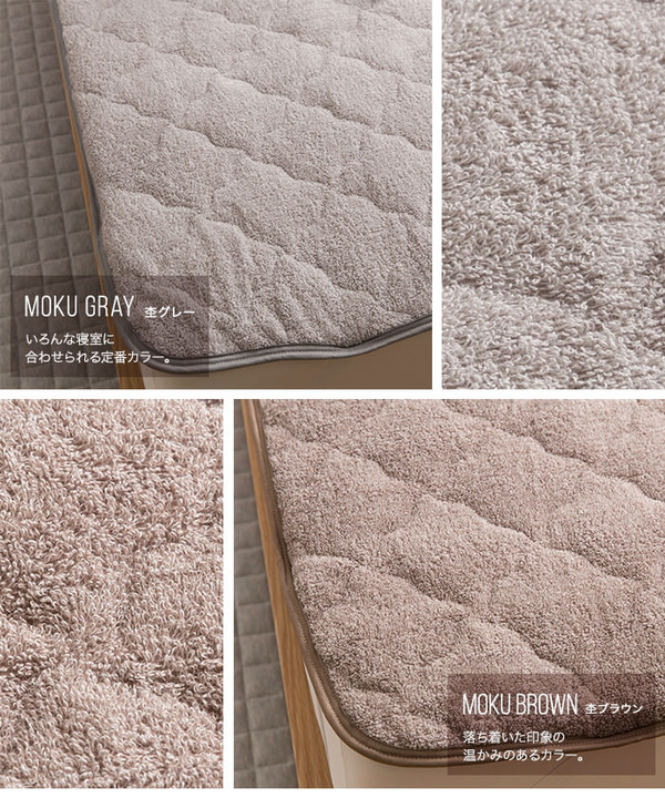 ナチュラル感溢れる無地の杢調カラー&汗ばむ夏に最適な綿100%パイルの敷パッドは、特殊なFBZ編みでパイルが抜けにくく、長くお使いいただけます